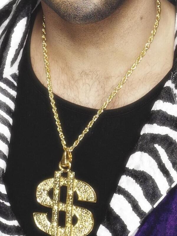 Elevate your costume with our Golden Dollar Sign Medallion Necklace. Stand out from the crowd with this eye-catching accessory.