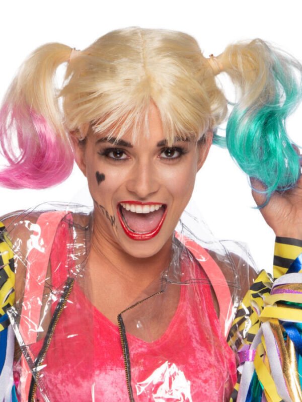 Channel your inner troublemaker with our Harley Quinn Birds of Prey Wig, featuring iconic blonde pigtails with playful pink and blue highlights