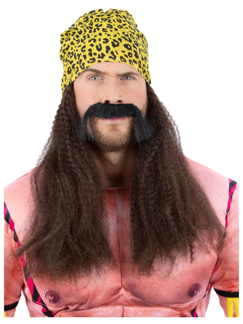 Transform into the ultimate 90s wrestling champ with this iconic costume kit complete with a brown wig and accessories.