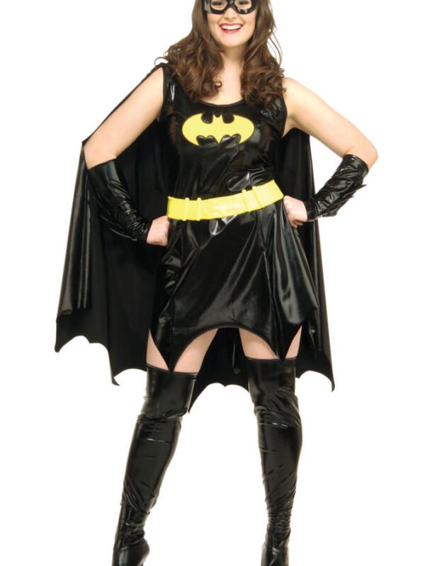 Transform into the fearless Batgirl with this plus size costume featuring a black jumpsuit, cape, belt, and mask. Perfect for Halloween and costume parties.