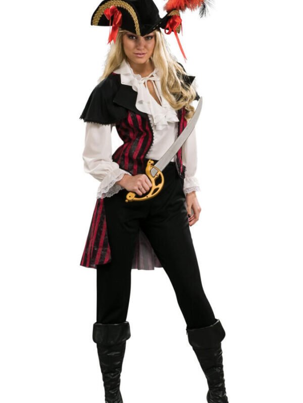 Command the seas with elegance in our Maria La Fay Women's Pirate Costume. Complete with a ruffled blouse, striped jacket, and ornate tricorn hat, this outfit promises a look of daring and adventure for any festive or themed occasion