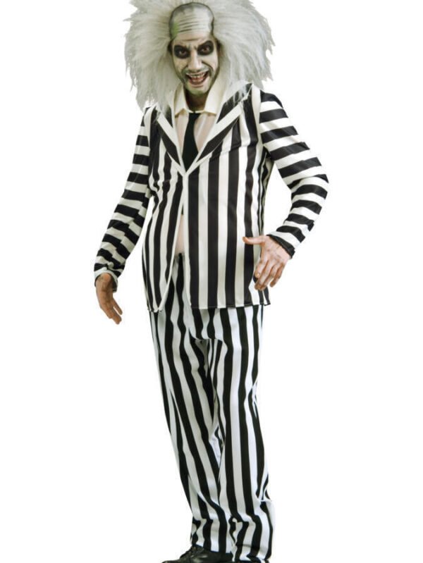 Dive into the whimsical world of the undead with our Beetlejuice Costume, featuring the iconic black and white striped suit and tie. Channel your inner ghoul and make an unforgettable entrance this Halloween
